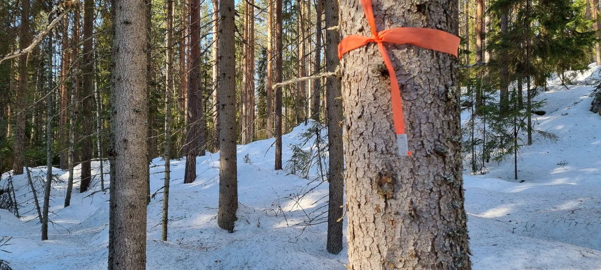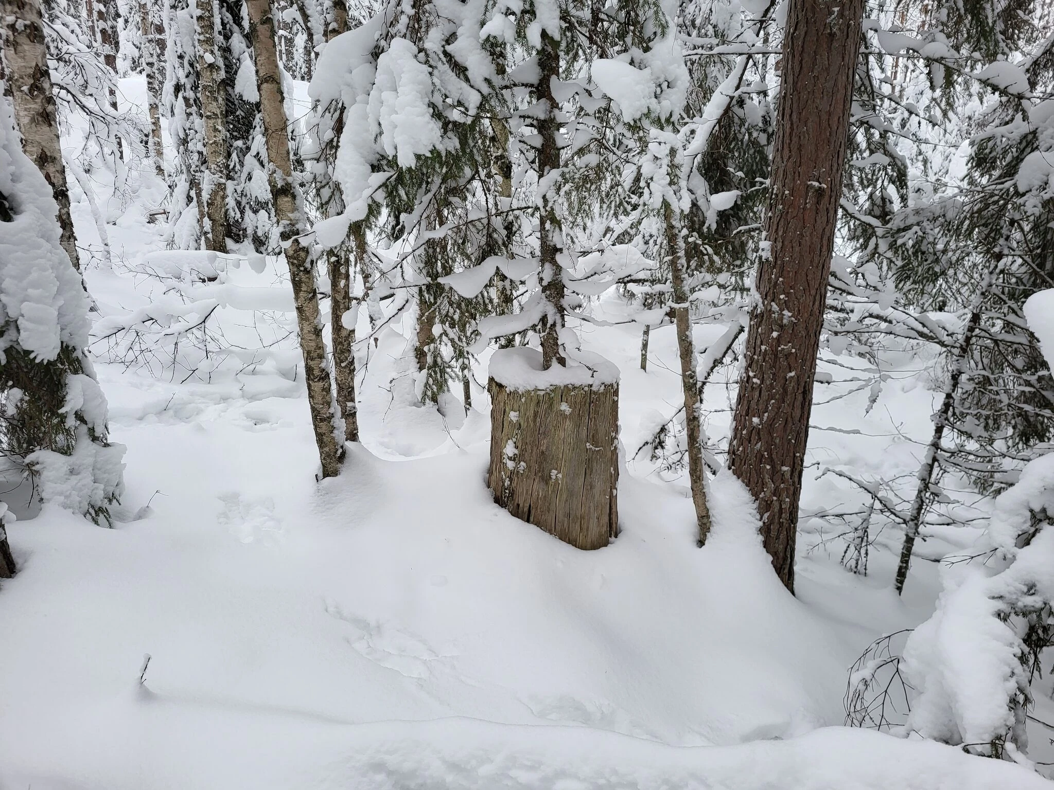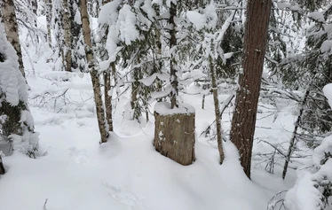 Starting from the sand pit, the trail section runs on flat terrain with only minor differences in height. Halfway through the section, the trail begins to gradually climb over several hills to the northern turning point, from where it turns back south along the old ski trail. Before the northern turning point, a forested swamp area can be seen on the left in the direction of movement, through which the trail has previously passed. The trail section is easy when moving with snowshoes and with wide skishoes.