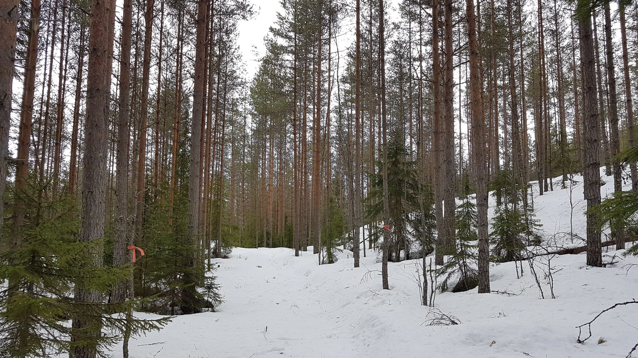 Along the trail, the types of forest and trees vary as the trail progresses. In some places, the terrain is open and the trees are older. In the middle of the section, the trail crosses the border of the forest type, where you can see a few fired tree stumps. In the final section, the trail returns to the same old logging area from the 1970s, i.e. a dense pine forest.