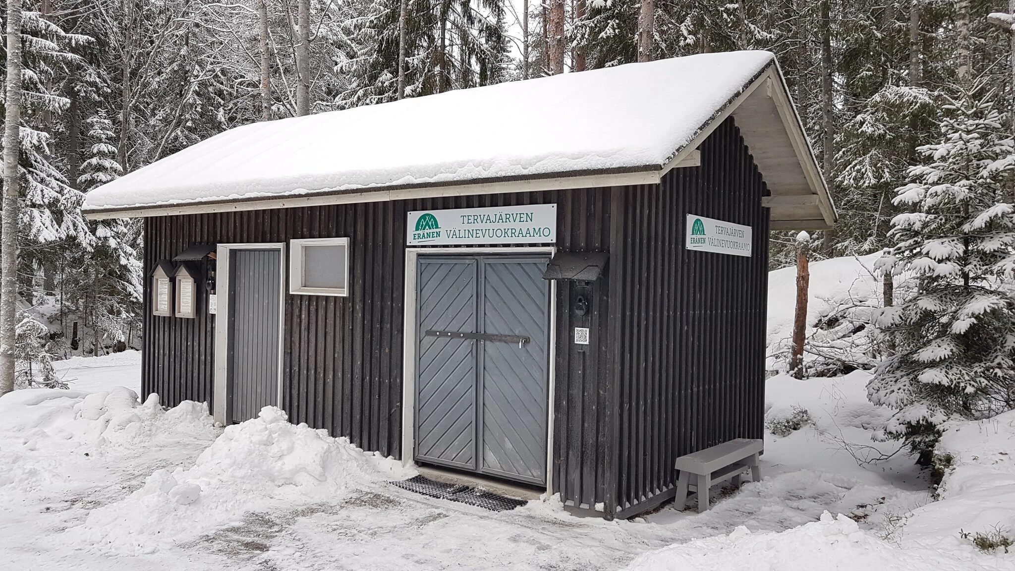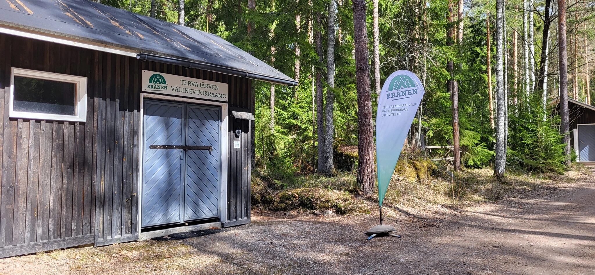 Tervajärvi Rental Base is located in Repovesi National Park at the gate of Tervajärvi at Kivisilmäntie 720 47910 Kouvola, right near the parking lot and the shore, next to the accessible toilet building. You can recognize Tervajärvi Rental Base by the sign above the door ("Tervajärven välinevuokraamo"). The canoes and rowing boat are located on the right side of the path leading from the parking lot to the shore.